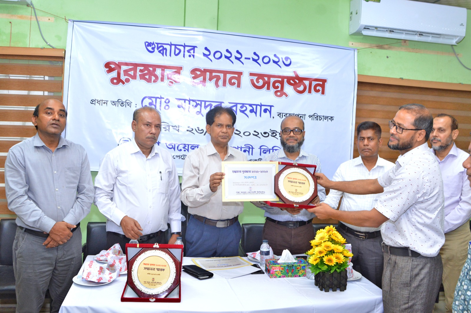 পদ্মা অয়েল কোম্পানী লিমিটেড কর্তৃক ২৬/৬/২০২৩ তারিখে ২০২২-২০২৩ অর্থ বছরের আওতায় কোম্পানির ১জন কর্মকর্তা, জনাব মোঃ বিল্লাল হোসেন, (আইডি নং- ৫২/৫৭৬) সহকারী ব্যবস্থাপক (হিসাব) এবং ১জন কর্মচারী জনাব মোঃ শফিউল্লাহ, (রেজি: নং- ৩৬৮২) অফিস সহায়ক-কে কোম্পানির ব্যবস্থাপনা পরিচালক মোঃ মাসুদুর রহমান কর্তৃক শুদ্ধাচার পুরস্কার প্রদান করা হয়।