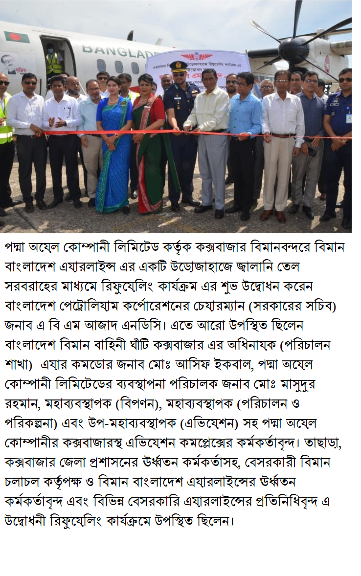 পদ্মা অয়েল কোম্পানী লিমিটেড কর্তৃক কক্সবাজার বিমানবন্দরে জ্বালানি তেল সরবরাহের মাধ্যমে রিফুয়েলিং কার্যক্রম এর শুভ উদ্বোধন।